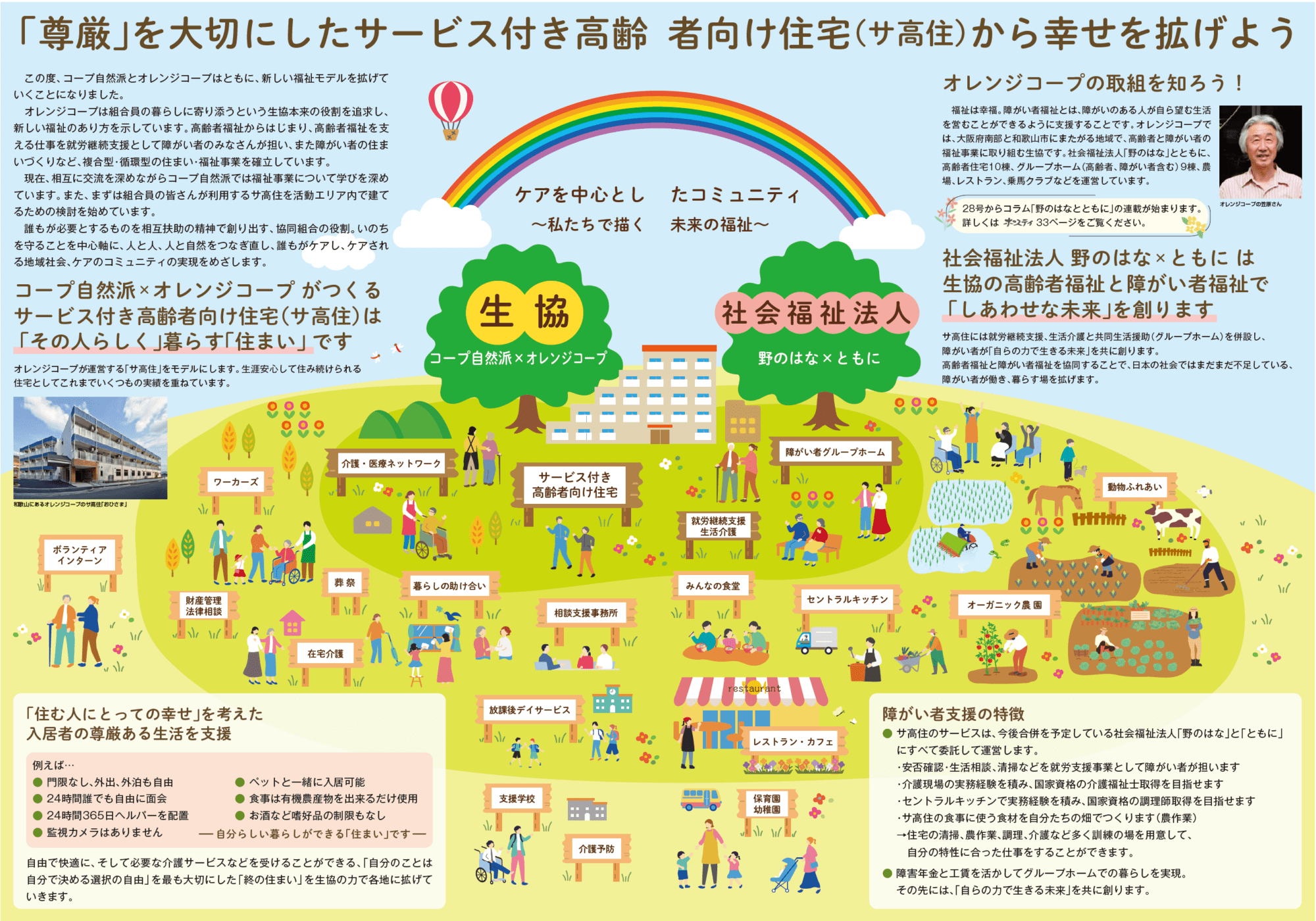 コープ自然派とオレンジコープはともに新しい福祉モデルを拡げていきます。誰もが必要とするものを相互扶助の精神で創り出す、協同組合の役割。いのちを守ることを中心軸に、人と人、人と自然をつなぎ直し、誰もがケアし、ケアされる地域社会、ケアのコミュニティの実現をめざします。