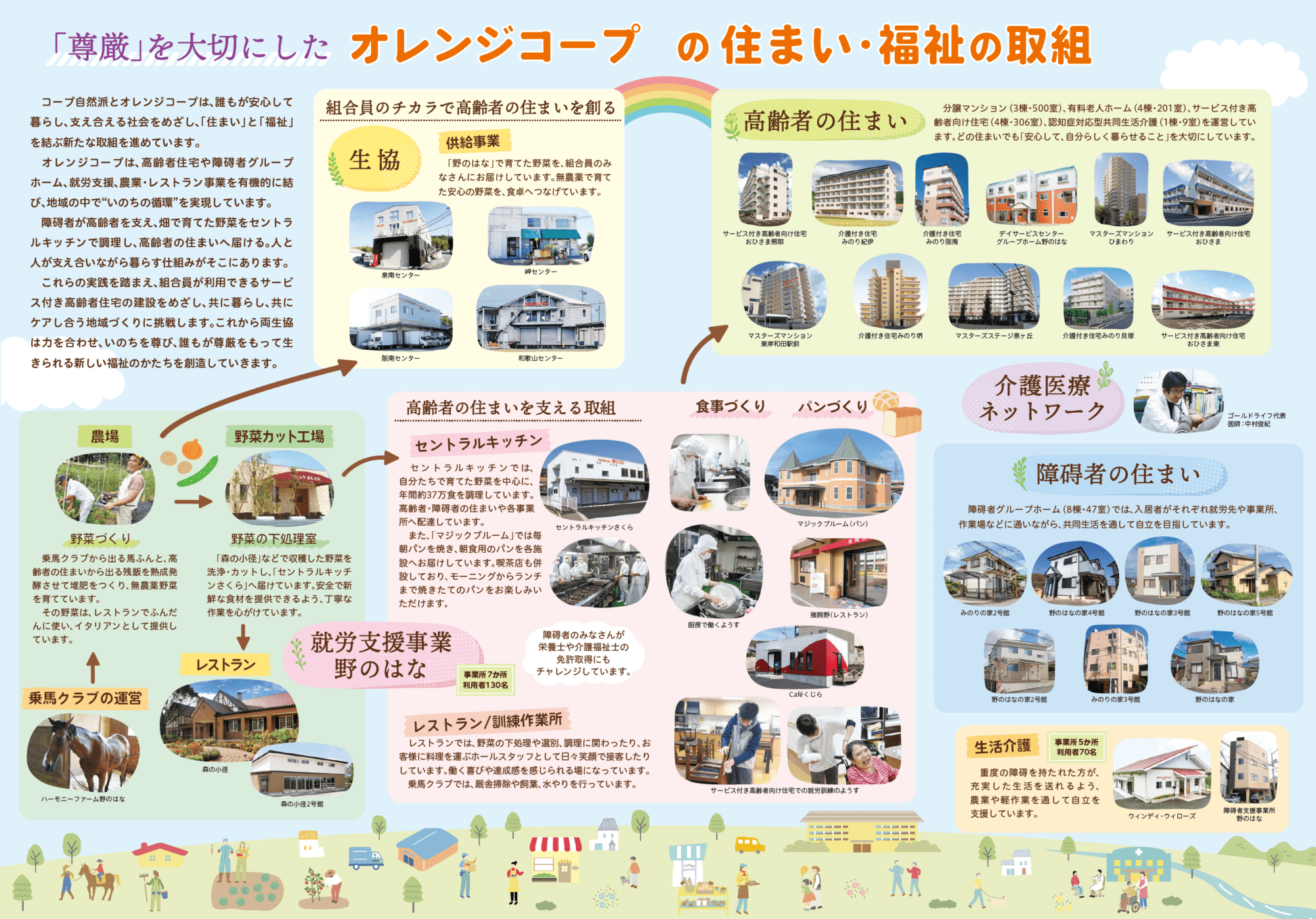 コープ自然派とオレンジコープはともに新しい福祉モデルを拡げていきます。誰もが必要とするものを相互扶助の精神で創り出す、協同組合の役割。いのちを守ることを中心軸に、人と人、人と自然をつなぎ直し、誰もがケアし、ケアされる地域社会、ケアのコミュニティの実現をめざします。
