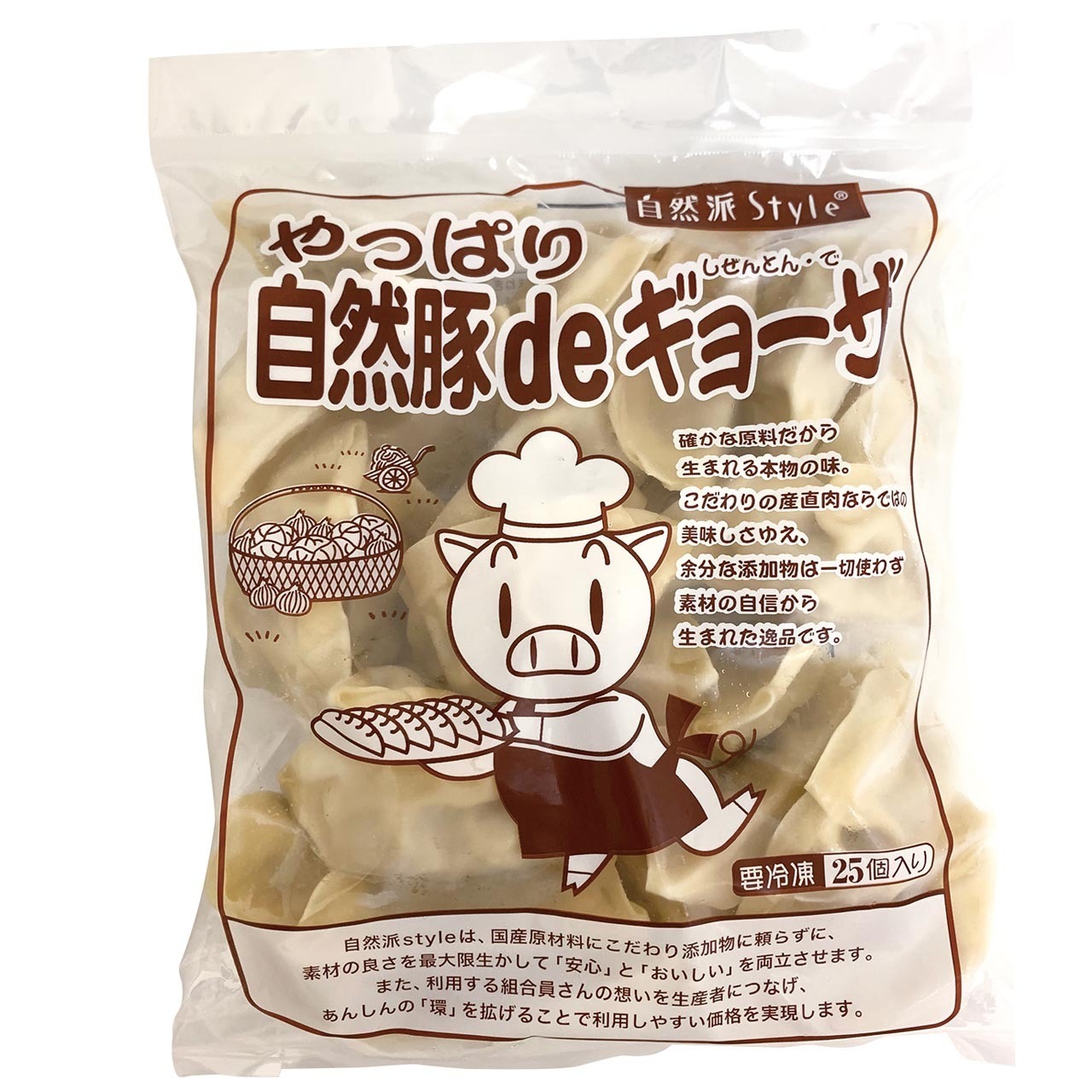 生協の産直豚肉「自然豚」をはじめ、野菜、皮の小麦粉までとことん国産原材料にこだわりました。素材の味が活きるシンプルな味わいが人気です。
