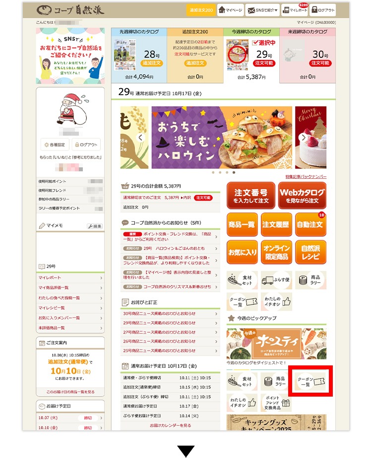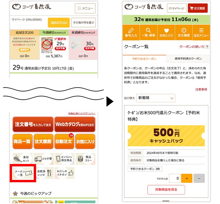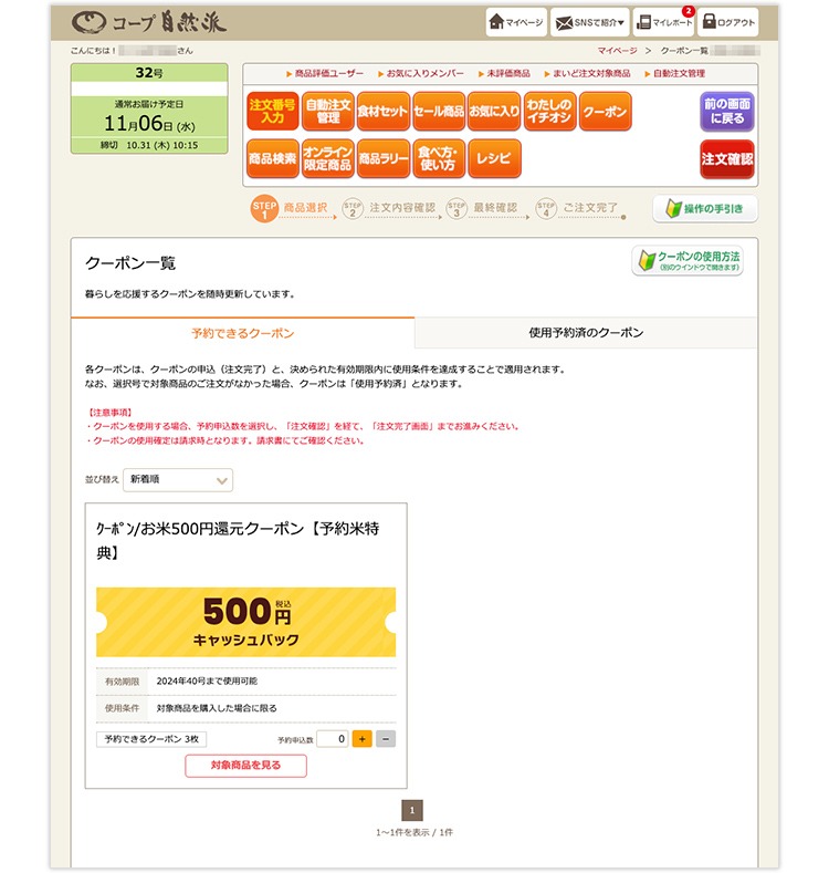 ※「予約できるクーポン」でクーポンを予約申込し、選択号で対象商品を購入しなかった場合は、注文締切後の翌日以降に、「使用予約済のクーポン」に表示されるようになります。