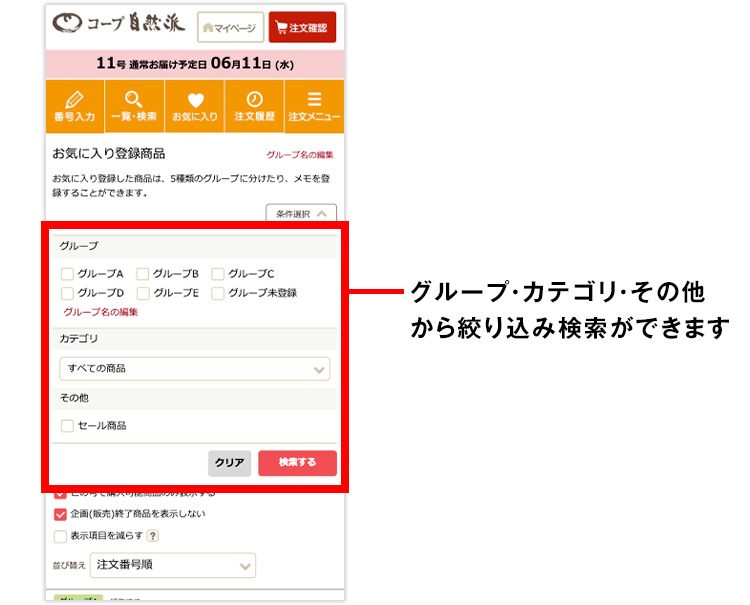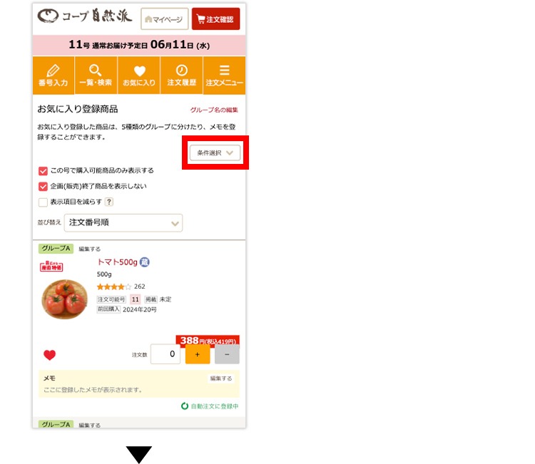 (2)お気に入りに登録した商品の一覧が表示されます。条件選択のタブをタップすると、お気に入りに登録した商品内でカテゴリやグループを絞り込んで検索することができます。