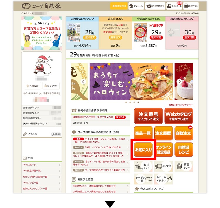 (1)マイページの「お気に入り」をクリックします。
