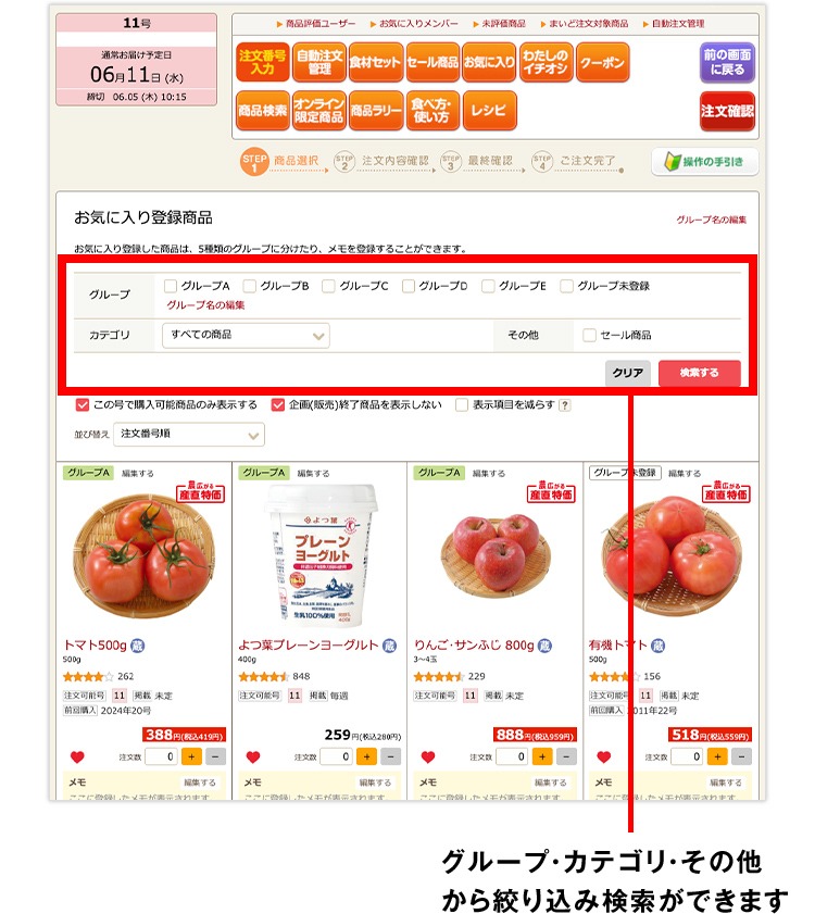 (2)お気に入りに登録した商品の一覧が表示されます。一覧画面ではお気に入りに登録した商品内でカテゴリやグループを絞り込んで検索することができます。