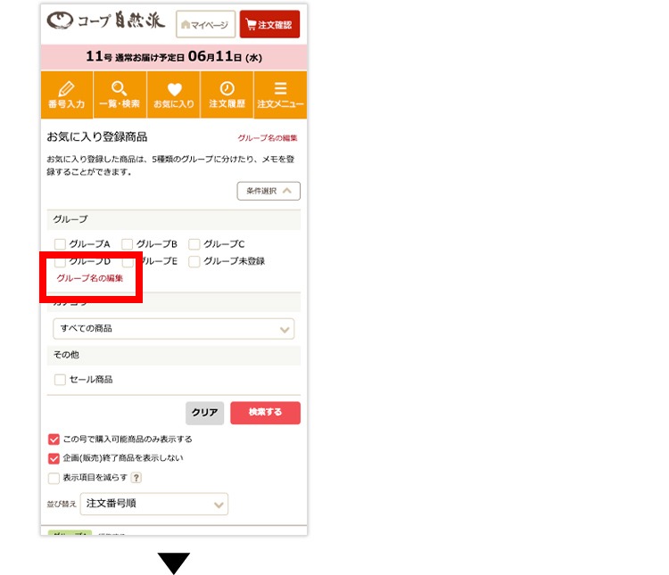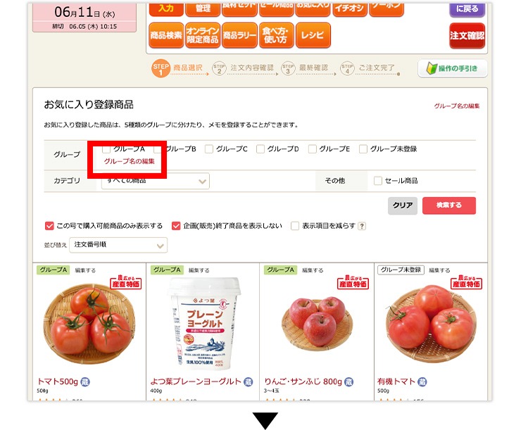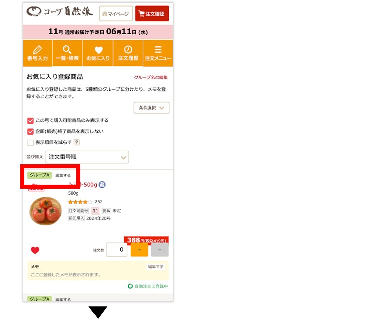 (2)お気に入り画面の商品欄から、グループを振り分けることができます。
