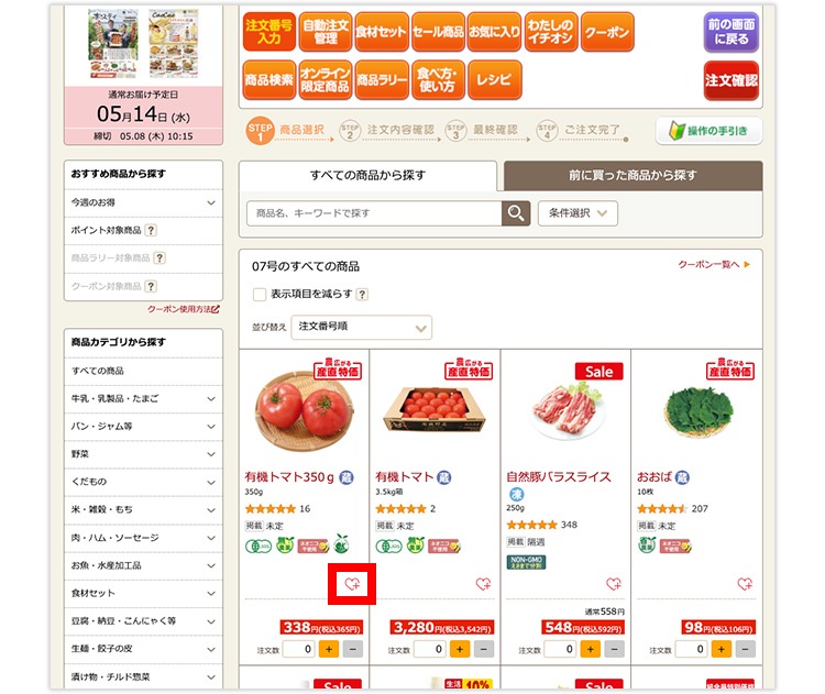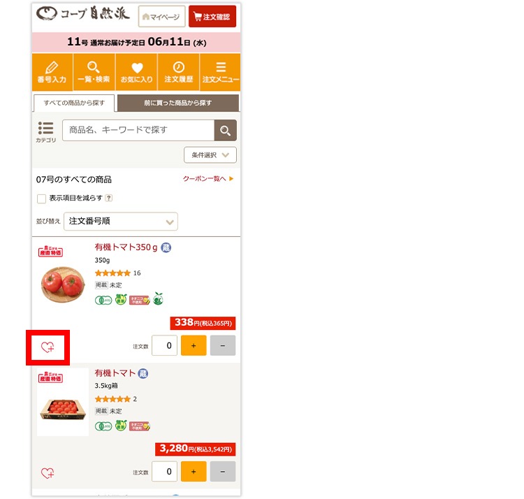 商品詳細画面や、ご注文確認画面などにあるお気に入りのアイコンをクリックすると商品を登録できます。