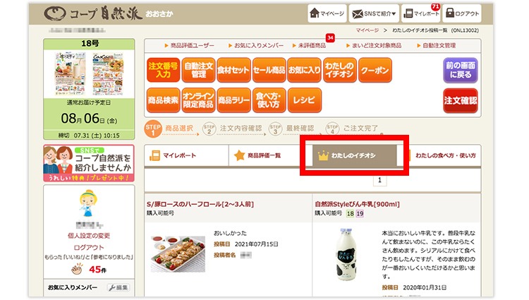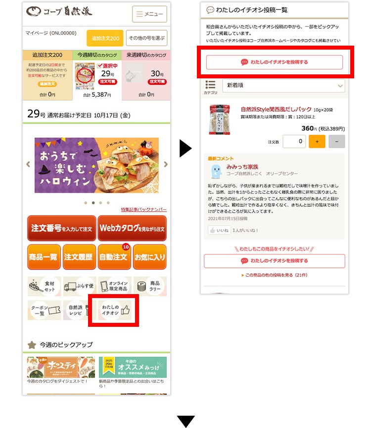 「わたしのイチオシ」では、組合員さんからいただいた商品紹介を閲覧したり、自身のイチオシ情報を投稿できます。