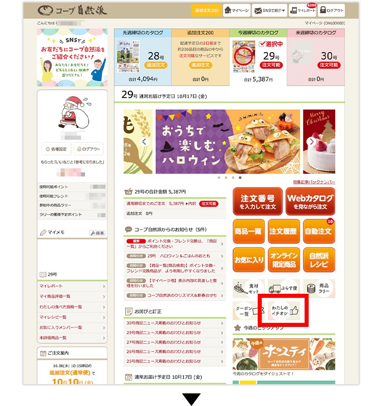 (1)マイページの「わたしのイチオシ」をクリックしてください。