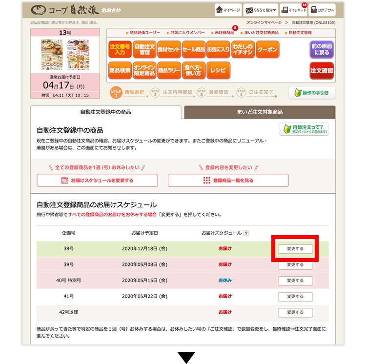 (1)自動注文登録中の商品一覧画面のお休みしたい号の「変更する」をクリックします。