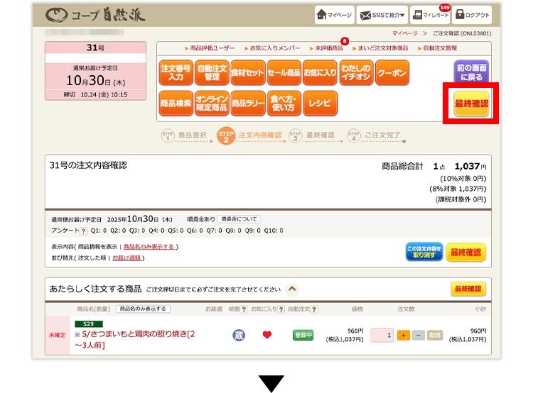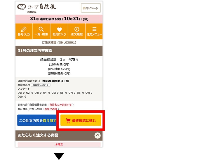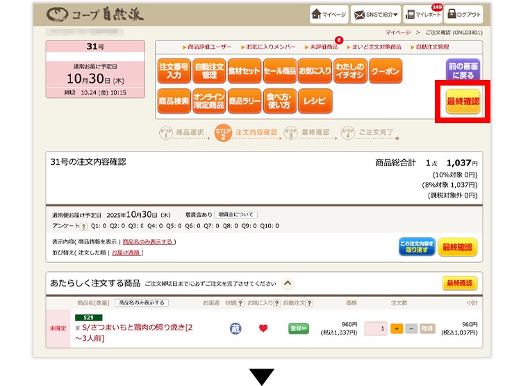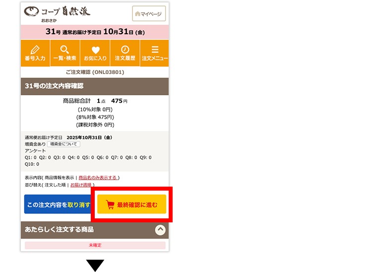 (4)「お休み」から「お届け」に変更した場合は、注文確認画面に進んでください。