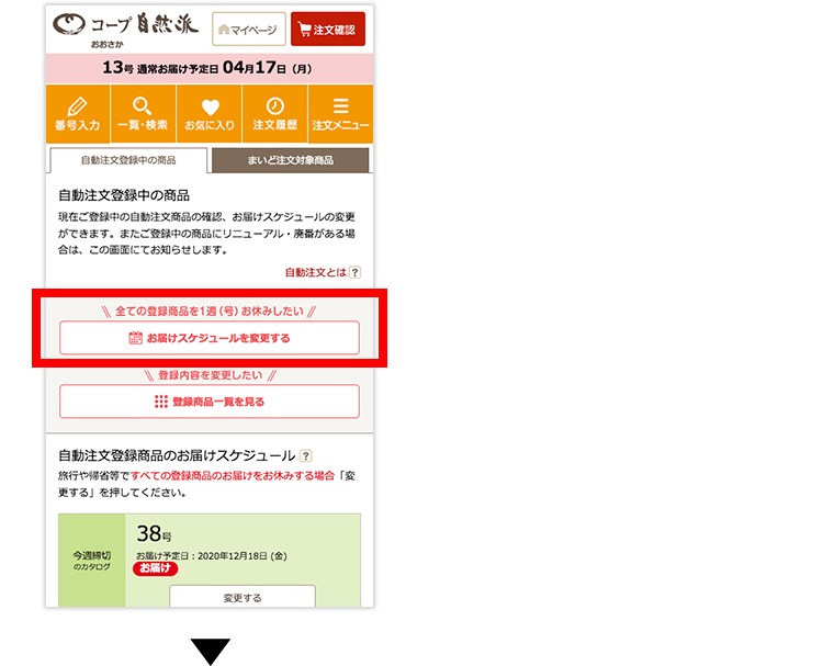 「お届け」から「お休み」に変更すると、すでに自動注文されていた商品が取り消されます。