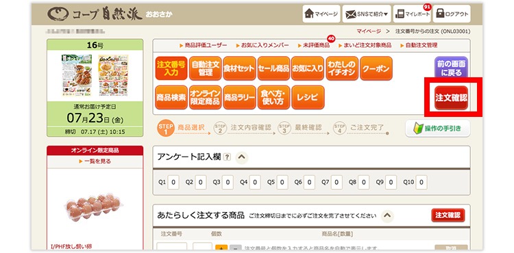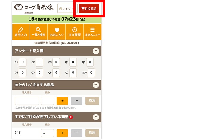 ※自然派オンラインでは「まいど注文」専用番号を使わず、「自動注文」の登録を自然派オンラインの画面上で行ってください。(「まいど注文」の専用番号を使うと、注文明細が正しくできません)