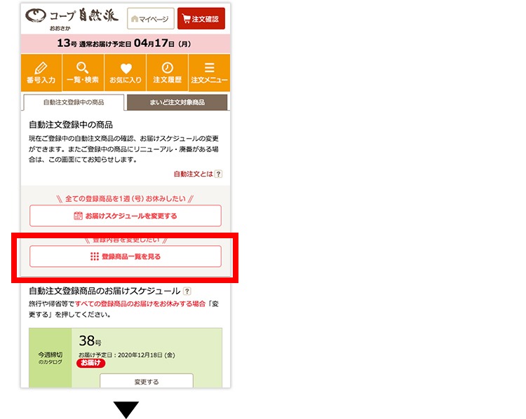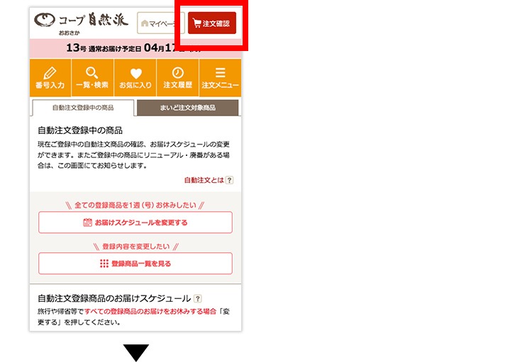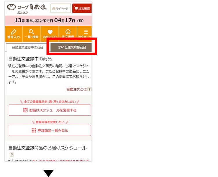 (1)マイページの「自動注文」をタップして、自動注文登録中の商品一覧画面に進みます。