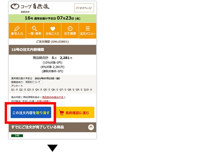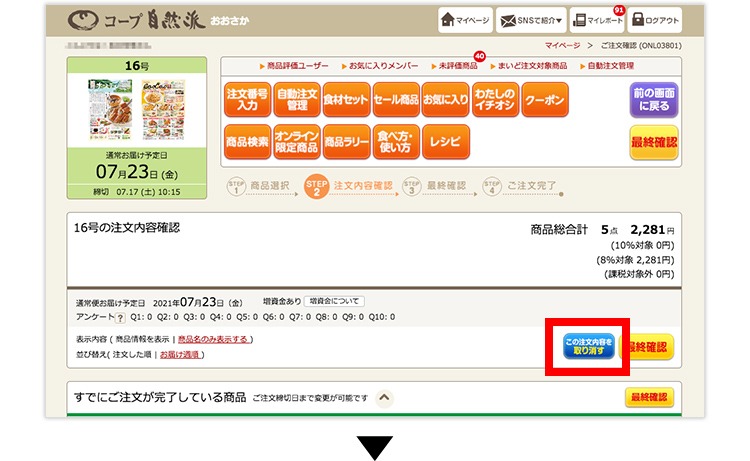 (2)取り消し後は注文確認画面に進み、注文を完了してください。