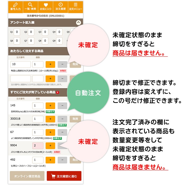 修正後は「注文確認」から「最終確認」へ進み、必ずご注文を完了してください。注文が完了すると「未確定」状態ではなくなります。