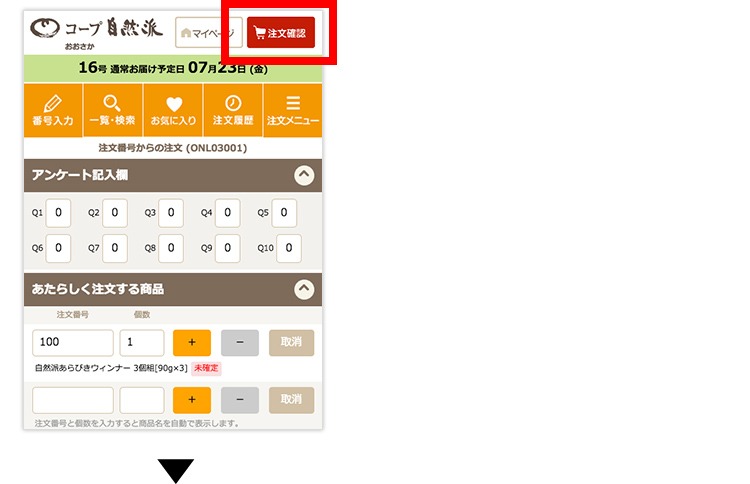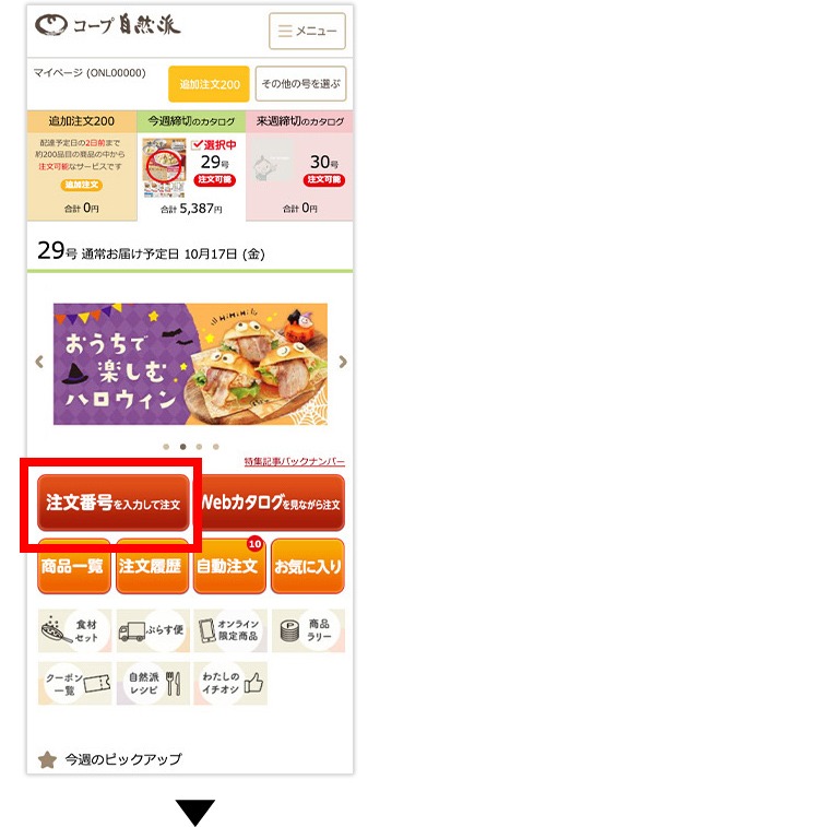 (1)マイページの「注文番号を入力して注文」をタップして、注文番号入力画面に進みます。