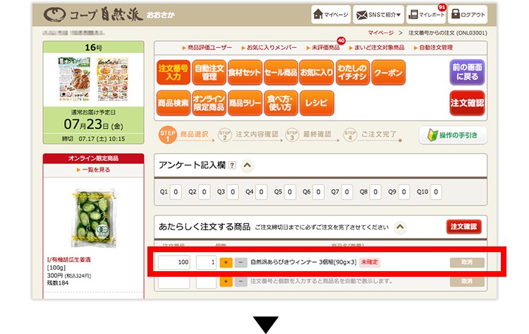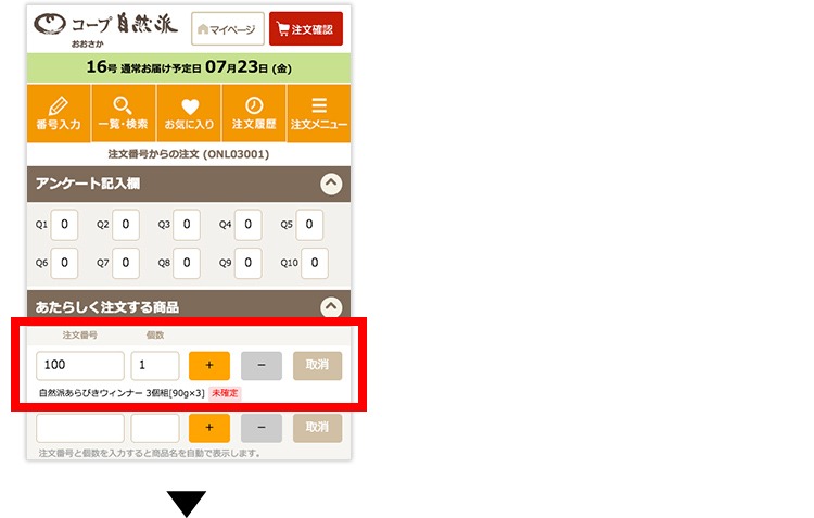 (2)注文番号と数量を入力すると商品名が自動で表示されます。入力に間違いがないかご確認ください。