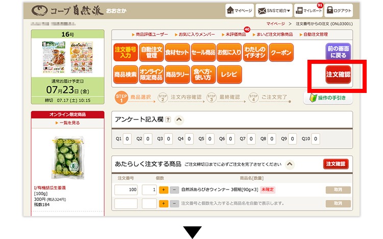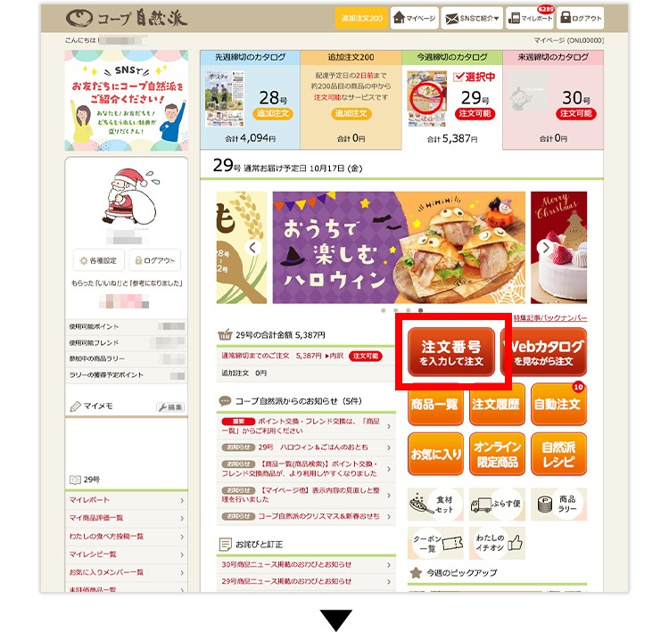 (1)マイページの「注文番号を入力して注文」をクリックし、注文番号入力画面に進みます。