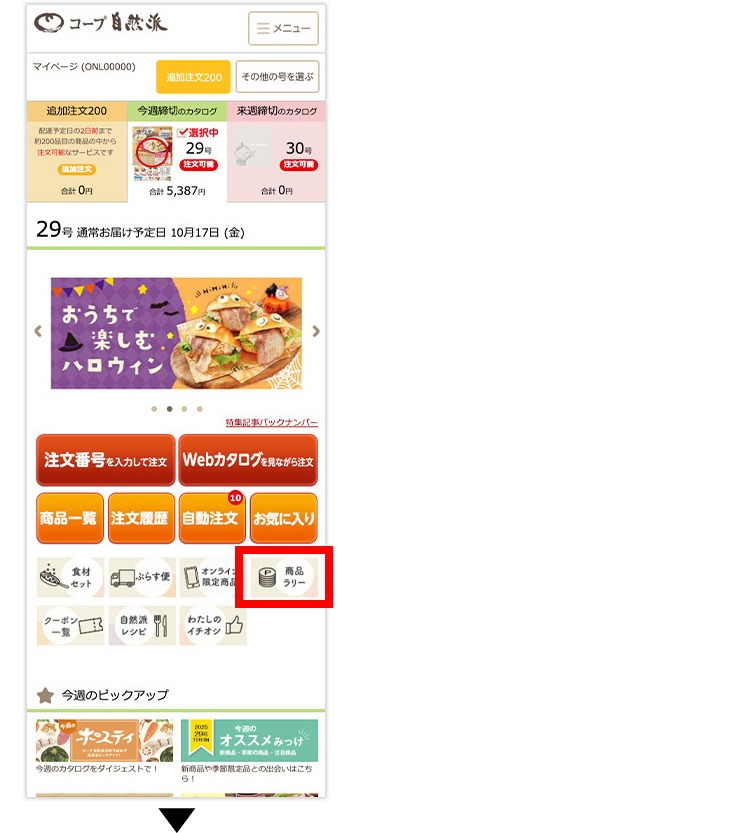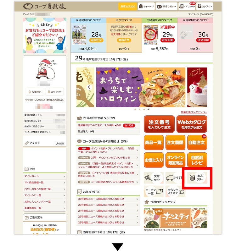 (1)マイページの「商品ラリー」バナーをクリックしてください。