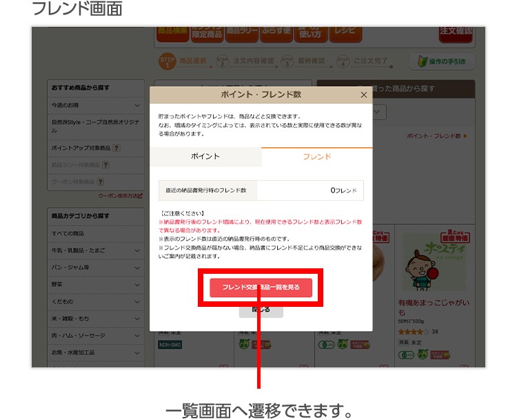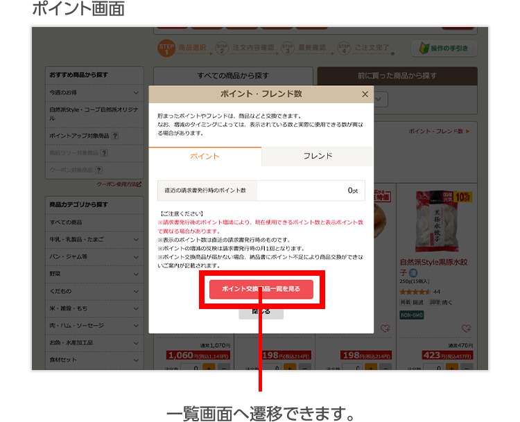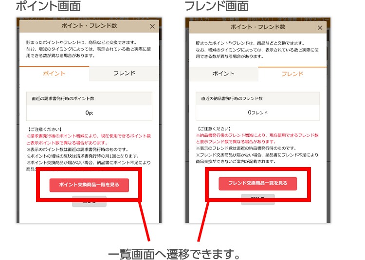 所持ポイント数・フレンド数の確認、商品一覧(商品検索)画面からポイント交換商品一覧やフレンド交換商品一覧画面に移動ができます。