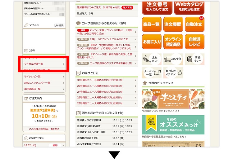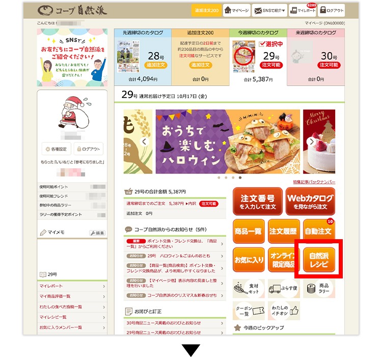 (1)マイページの注文ボタンから、自然派レシピページへ移動してください。