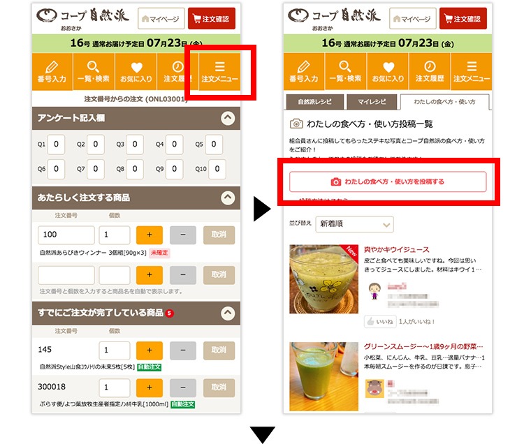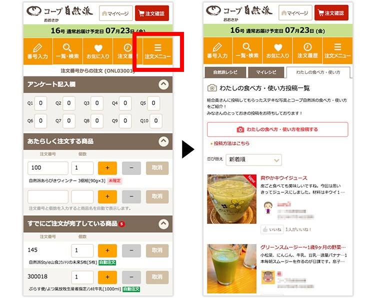 注文番号入力画面などの上部「注文メニュー」からわたしの食べ方・使い方一覧画面へ移動できます。