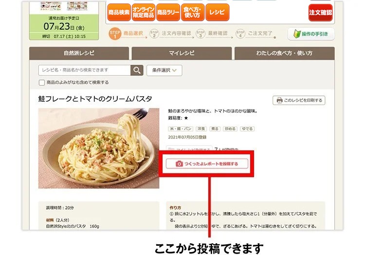自然派レシピの料理を作ったときは「つくったよレポート」から写真と感想を添えて「わたしの食べ方・使い方」に投稿することができます。