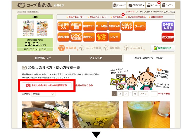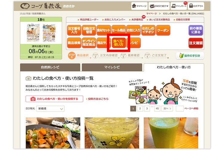 「わたしの食べ方・使い方」では、組合員さんからいただいた商品を使った料理写真を閲覧したり、自身のおすすめの使い方を写真とともに投稿できます。