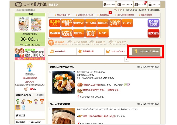 (2)「わたしの食べ方・使い方」をクリックすると自分が投稿したわたしの食べ方・使い方を確認できます。
