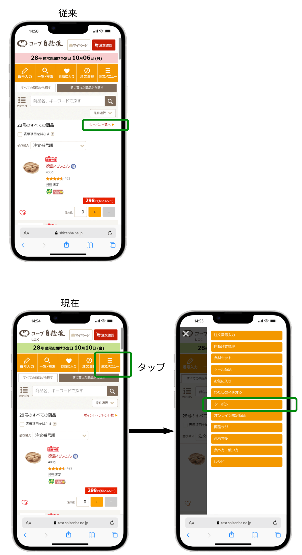 従来、「商品一覧(商品検索)」にあった「クーポン一覧へ」のリンクは、スマートフォンの場合はメニュー、パソコンの場合は上部にある注文メニューに移動しました。
