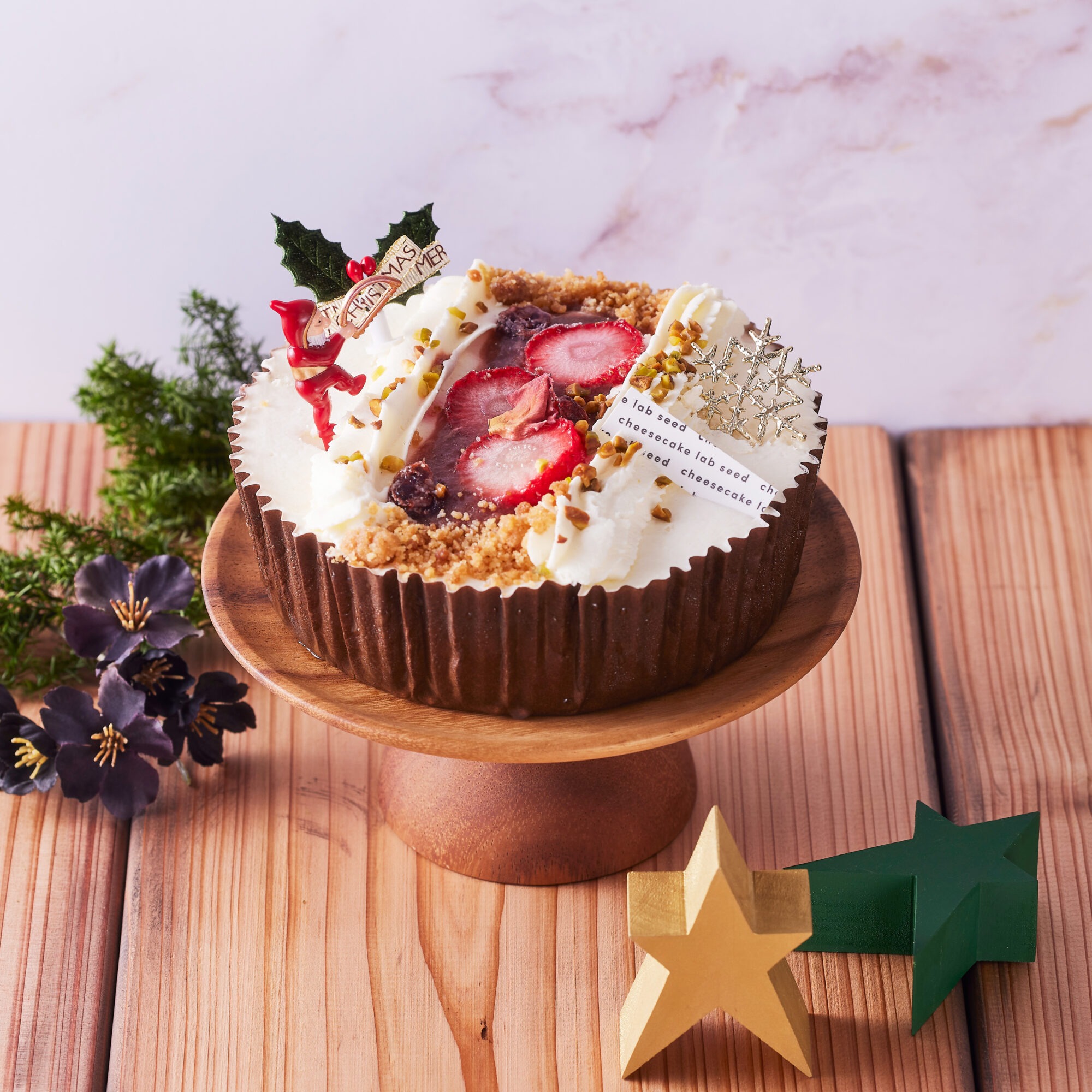 玄米粉で焼き上げたふわふわもちもち食感のチーズケーキ。チーズケーキと生クリームの上に規格外のエシカル苺と粗糖で炊いた、seed自家製苺グラサージュを流し込み苺を載せて、ドライフルーツ、玄米粉で作ったクランチクッキーをアクセントに大人かわいく上げました。規格外のフルーツをアップサイクルしたエシカルなチーズケーキです。