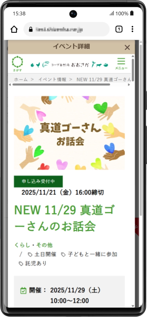 ・表示内容はイベントの基本情報のみです。イベント名を押すと、モーダルウィンドウで生協HPのイベントページが開きます。