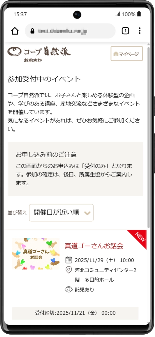 2025年11月5日のメンテナンス終了後より、所属生協のイベント申込ができるようになりました。