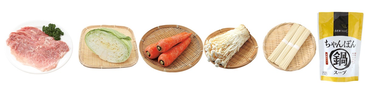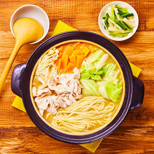 麺入りでがっつり「豚肉のちゃんぽん風鍋」も、鍋スープで簡単!「じゃがいもと小松菜のさっと炒め」を添えて栄養バランスも◎