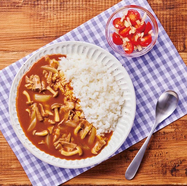 しっかり食べられる洋風メニューには「ハヤシライス」、さっぱりいただく「ミニトマトのオニオンマリネ」で!