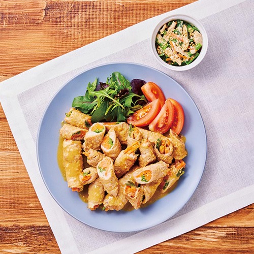 「肉巻きのみそだれ焼き」&「鶏肉と小松菜の胡麻マヨサラダ」なら、野菜が多くてもお箸がすすむ!