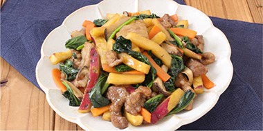 「安心・安全の豚肉を食べたい!」という組合員の願いから誕生したコープ自然派の産直豚「自然豚」(えさまで非遺伝子組み換え[分別管理]/アニマルウェルフェアに配慮した生産体制)、細切りカット済の国産野菜(コープ自然派の産直野菜を優先)、化学調味料不使用のコープ自然派オリジナルのたれ、計量済の片栗粉をセットしています。