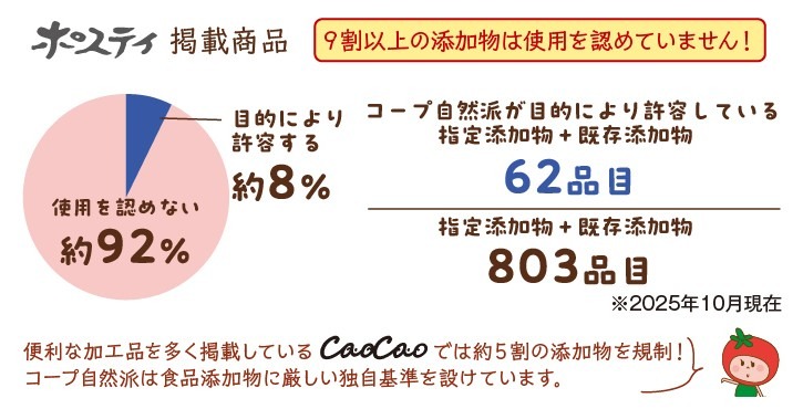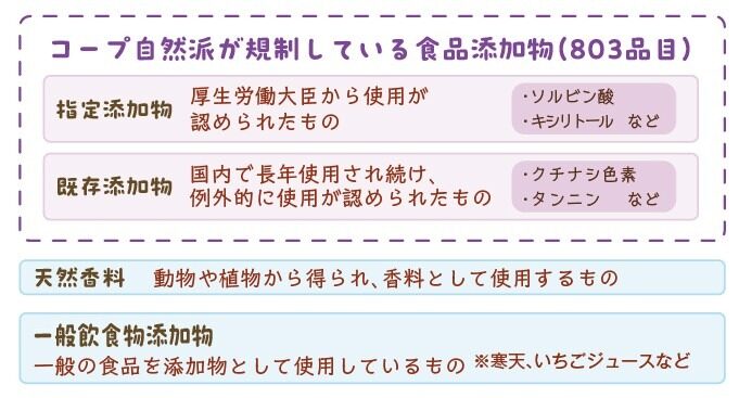 日本では約1500品目もの食品添加物が認可されています。このうちコープ自然派では指定添加物全476品目、既存添加物全327品目の合計803品目を規制の対象としています。