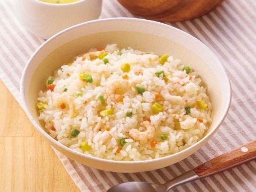 天然エビと産直・ビオトープ米を使用したエビピラフ。国産たまねぎ・コーン・いんげん・人参を使用し彩りよく仕上げました。
