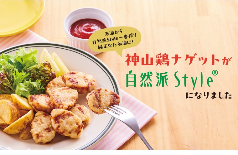 今回ご紹介する「自然派Style神山鶏ナゲット」は、揚げ油に、皆さんおなじみNON-GMOの「自然派Style一番搾り純正なたね油」を使用することになり、新たにプライベートブランド自然派Styleの仲間入りをしました。もちろん、神山鶏そのものも「えさまで安心」にこだわり、遺伝子組み換え混入防止管理済のとうもろこしやお米を食べて育てられています。