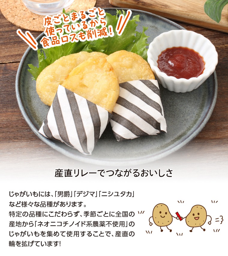 じゃがいもの味が感じられるようにシンプルに塩こしょうで味付けをしました。ぱくっと食べやすい小さめサイズ!