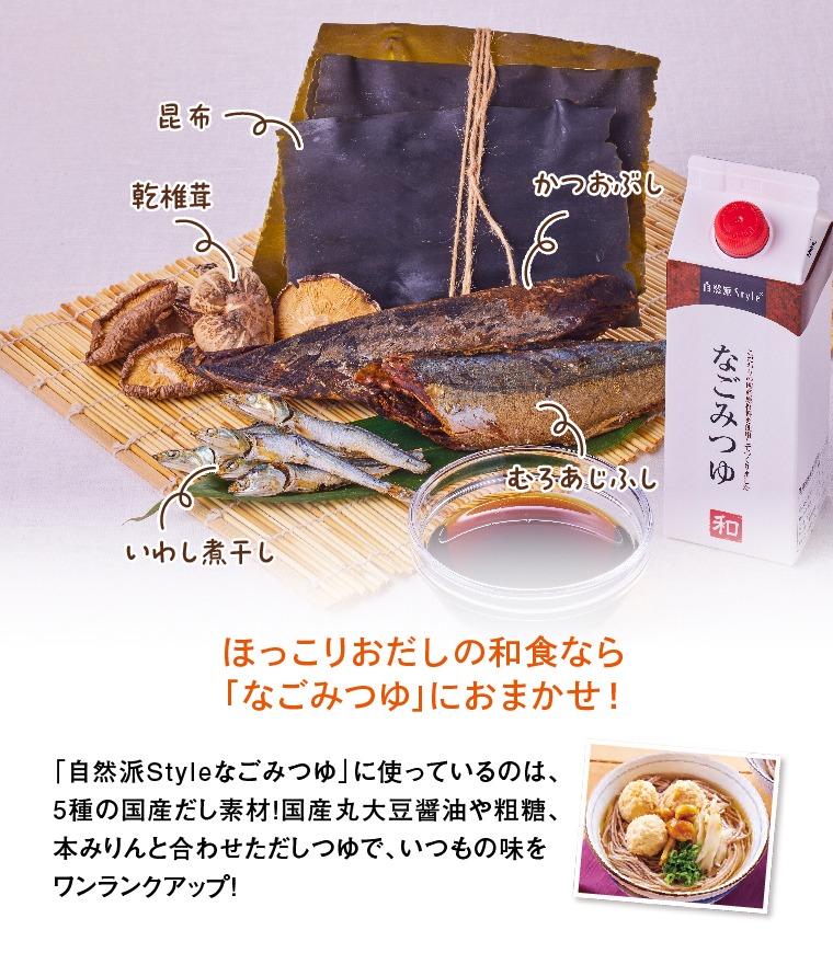 「なごみつゆ」は、そうめんや蕎麦だけでなく、納豆、煮物、和え物など、さまざまな和食の味を簡単に、そしておいしく決めてくれます。これからの季節は、お鍋のつゆとしてもおすすめ。蓋を開けた瞬間に広がる5種類のだしの香りも、お楽しみください。