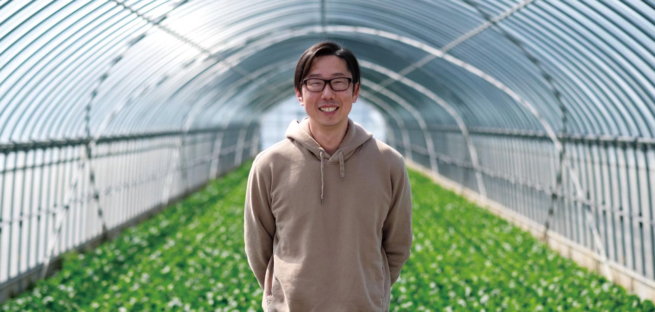 北野町は筑後平野のなかでも比較的気候が穏やかで、冬場の晴天率も高く、葉物野菜にとって理にかなった土地柄です。現在80棟のハウスで周年栽培を行っていますが、ただ量をつくるのではなく、いつ収穫しても安定した品質を保つことを大切にしています。特に水やりについては必要な水を必要な分だけ与え、余分な水は与えないことを徹底しています。
