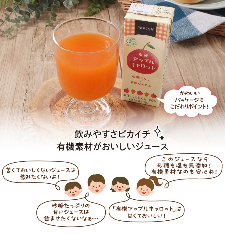 有機栽培のりんごと国産有機にんじんの自然な甘みが味わえる、お子さんにも飲みやすいジュースです。